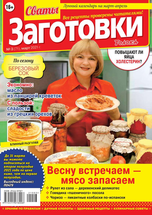 Более 100 рецептов заготовок от Сватов в каждом номере: соленья и маринады, салаты и ассорти, соусы и приправы, заготовки к сезону, сладкие заготовки, напитки, винный погребок, мясные деликатесы, здоровые рецепты, целебные заготовки, дачные хлопоты, правила хранения, а также кроссворды и сканворды для досуга. Лучшими рецептами поделятся с вами сваты Любовь Сергеевна и Михаил Михайлович.