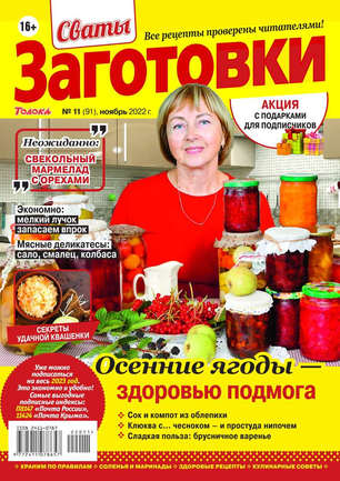 Более 100 рецептов заготовок от Сватов в каждом номере: соленья и маринады, салаты и ассорти, соусы и приправы, заготовки к сезону, сладкие заготовки, напитки, винный погребок, мясные деликатесы, здоровые рецепты, целебные заготовки, дачные хлопоты, правила хранения, а также кроссворды и сканворды для досуга. Лучшими рецептами поделятся с вами сваты Любовь Сергеевна и Михаил Михайлович.