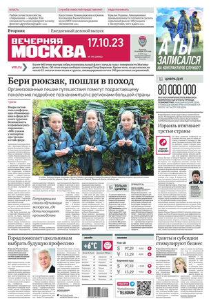 «Вечерняя Москва» — ежедневная российская вечерняя газета, старейшее из вечерних изданий в России, учрежденное в 1923 году. Выходит пять дней в неделю, кроме субботы и воскресенья. Отличается тем, что рассказывает о событиях еще не завершившегося дня. Оперативно освещает хронику и особенности жизни Москвы, охватывает все слои общества и большинство профессиональных и возрастных групп читателей.Издание представлено тремя выпусками – утренним ежедневным, вечерним (выходит три раза в неделю), еженедельным (выходит по четвергам).