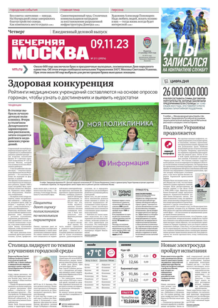 «Вечерняя Москва» — ежедневная российская вечерняя газета, старейшее из вечерних изданий в России, учрежденное в 1923 году. Выходит пять дней в неделю, кроме субботы и воскресенья. Отличается тем, что рассказывает о событиях еще не завершившегося дня. Оперативно освещает хронику и особенности жизни Москвы, охватывает все слои общества и большинство профессиональных и возрастных групп читателей.Издание представлено тремя выпусками – утренним ежедневным, вечерним (выходит три раза в неделю), еженедельным (выходит по четвергам).