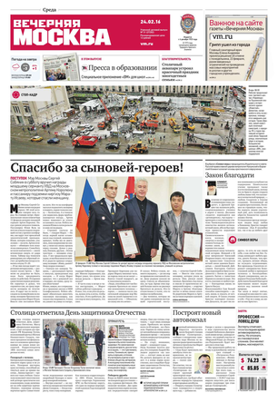 «Вечерняя Москва» — ежедневная российская вечерняя газета, старейшее из вечерних изданий в России, учрежденное в 1923 году. Выходит пять дней в неделю, кроме субботы и воскресенья. Отличается тем, что рассказывает о событиях еще не завершившегося дня. Оперативно освещает хронику и особенности жизни Москвы, охватывает все слои общества и большинство профессиональных и возрастных групп читателей.Издание представлено тремя выпусками – утренним ежедневным, вечерним (выходит три раза в неделю), еженедельным (выходит по четвергам).