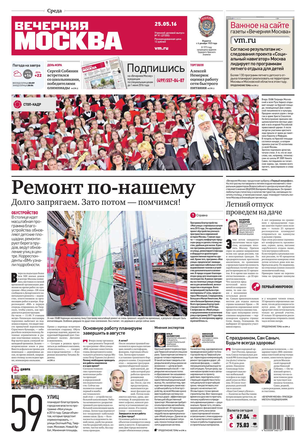 «Вечерняя Москва» — ежедневная российская вечерняя газета, старейшее из вечерних изданий в России, учрежденное в 1923 году. Выходит пять дней в неделю, кроме субботы и воскресенья. Отличается тем, что рассказывает о событиях еще не завершившегося дня. Оперативно освещает хронику и особенности жизни Москвы, охватывает все слои общества и большинство профессиональных и возрастных групп читателей.Издание представлено тремя выпусками – утренним ежедневным, вечерним (выходит три раза в неделю), еженедельным (выходит по четвергам).