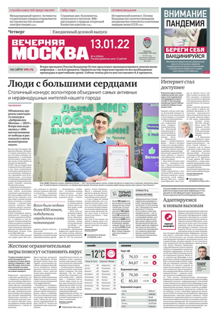 «Вечерняя Москва» — ежедневная российская вечерняя газета, старейшее из вечерних изданий в России, учрежденное в 1923 году. Выходит пять дней в неделю, кроме субботы и воскресенья. Отличается тем, что рассказывает о событиях еще не завершившегося дня. Оперативно освещает хронику и особенности жизни Москвы, охватывает все слои общества и большинство профессиональных и возрастных групп читателей.Издание представлено тремя выпусками – утренним ежедневным, вечерним (выходит три раза в неделю), еженедельным (выходит по четвергам).