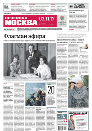 «Вечерняя Москва» — ежедневная российская вечерняя газета, старейшее из вечерних изданий в России, учрежденное в 1923 году. Выходит пять дней в неделю, кроме субботы и воскресенья. Отличается тем, что рассказывает о событиях еще не завершившегося дня. Оперативно освещает хронику и особенности жизни Москвы, охватывает все слои общества и большинство профессиональных и возрастных групп читателей.Издание представлено тремя выпусками – утренним ежедневным, вечерним (выходит три раза в неделю), еженедельным (выходит по четвергам).