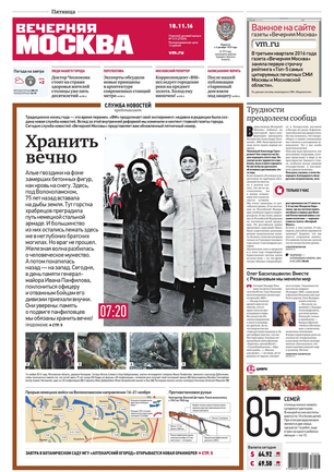 «Вечерняя Москва» — ежедневная российская вечерняя газета, старейшее из вечерних изданий в России, учрежденное в 1923 году. Выходит пять дней в неделю, кроме субботы и воскресенья. Отличается тем, что рассказывает о событиях еще не завершившегося дня. Оперативно освещает хронику и особенности жизни Москвы, охватывает все слои общества и большинство профессиональных и возрастных групп читателей.Издание представлено тремя выпусками – утренним ежедневным, вечерним (выходит три раза в неделю), еженедельным (выходит по четвергам).