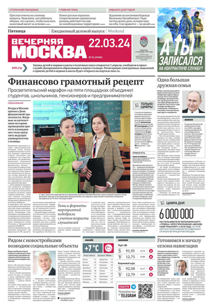 Еженедельный выпуск «Вечерней Москвы» — это значимые события недели, афиша города, новости из сферы отдыха и развлечений, телепрограмма с анонсами и комментариями, авторские колонки журналистов и авторитетные мнения экспертов, детская страничка, специальная рубрика «Золушка», интересные репортажи о необычных судьбах московских жителей, постоянные конкурсы и викторины.