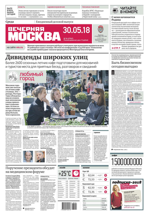 «Вечерняя Москва» — ежедневная российская вечерняя газета, старейшее из вечерних изданий в России, учрежденное в 1923 году. Выходит пять дней в неделю, кроме субботы и воскресенья. Отличается тем, что рассказывает о событиях еще не завершившегося дня. Оперативно освещает хронику и особенности жизни Москвы, охватывает все слои общества и большинство профессиональных и возрастных групп читателей.Издание представлено тремя выпусками – утренним ежедневным, вечерним (выходит три раза в неделю), еженедельным (выходит по четвергам).