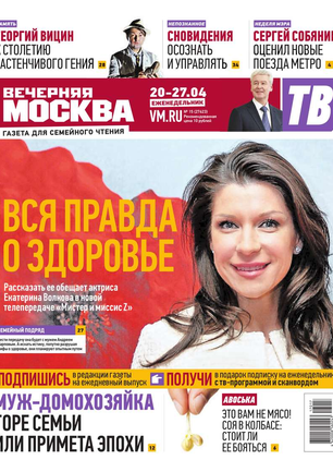 Еженедельный выпуск «Вечерней Москвы» — это значимые события недели, афиша города, новости из сферы отдыха и развлечений, телепрограмма с анонсами и комментариями, авторские колонки журналистов и авторитетные мнения экспертов, детская страничка, специальная рубрика «Золушка», интересные репортажи о необычных судьбах московских жителей, постоянные конкурсы и викторины.